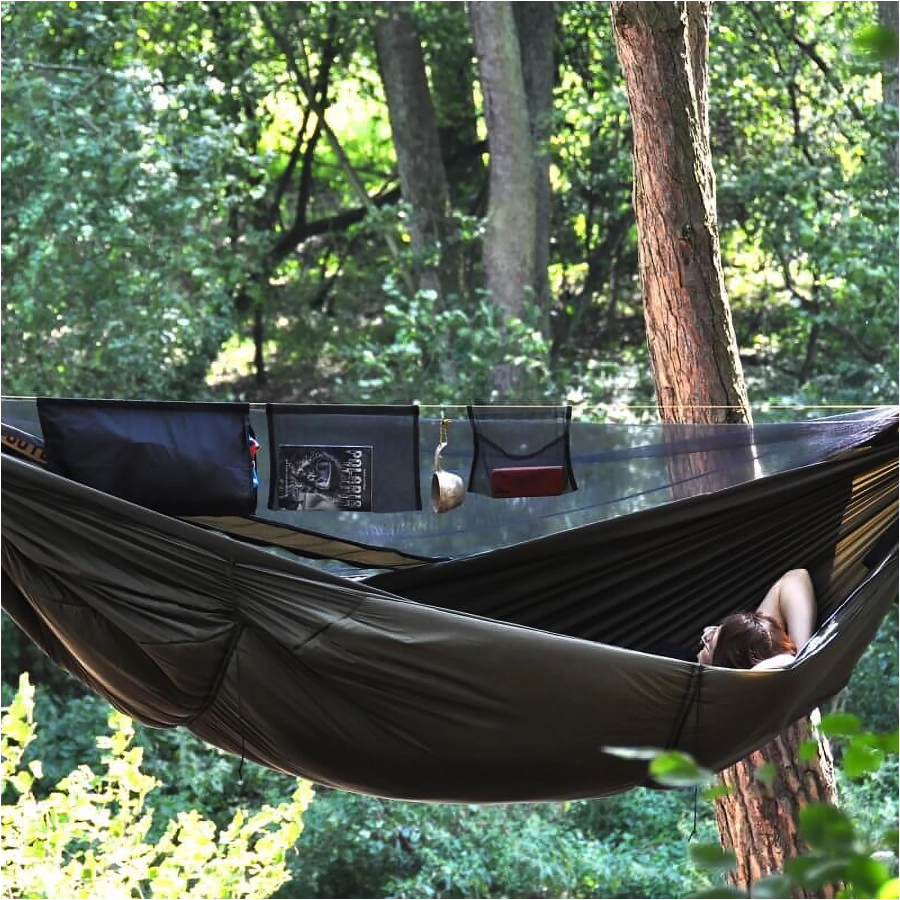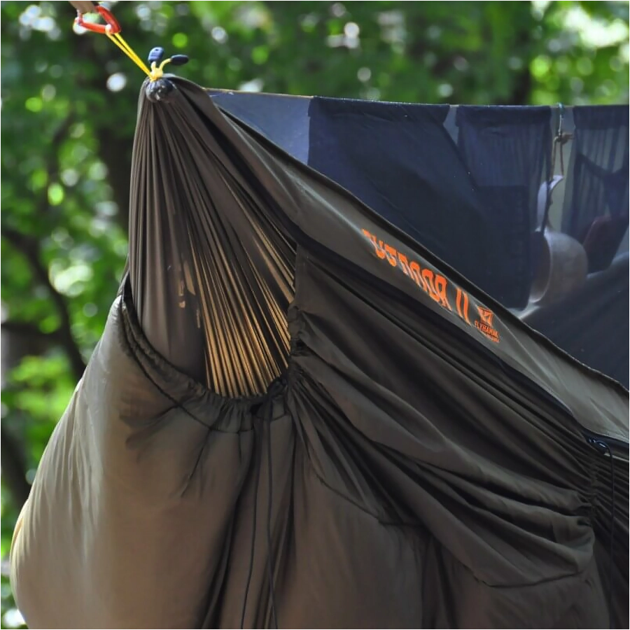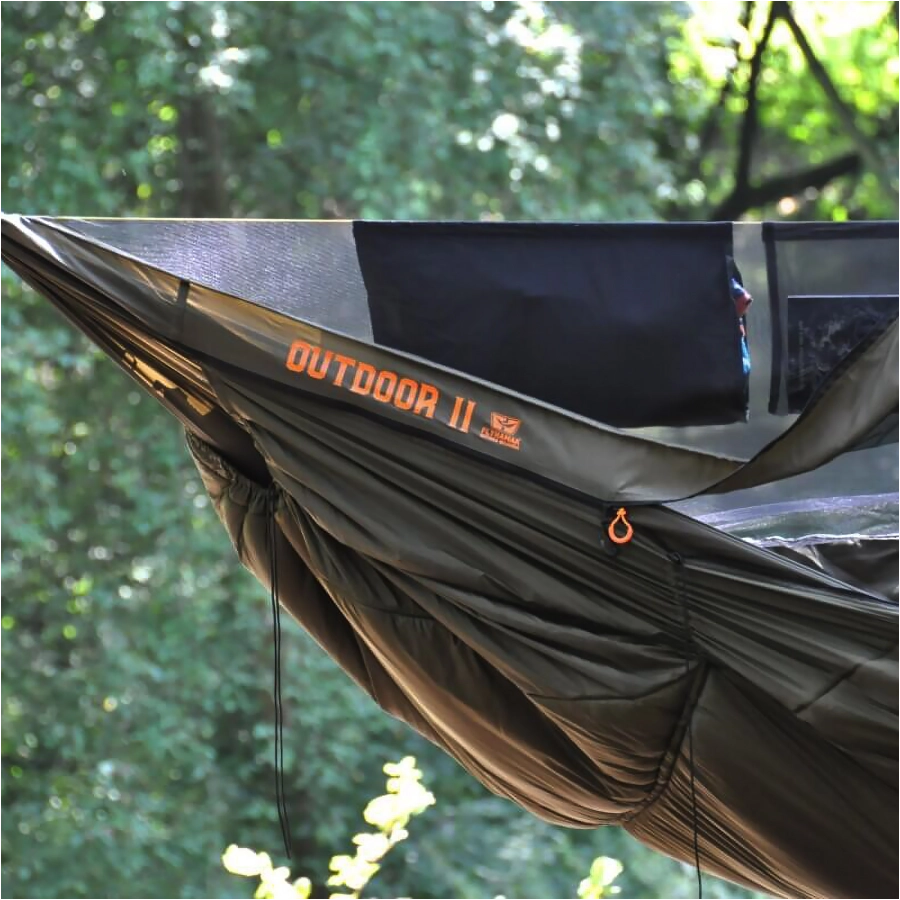 Flyhamak OutDoor II to zmodernizowana wersja modelu Outdoor I wyposażona w moskitierę oraz zintegrowany underblanket umożliwiający zastosowania dodatkowego ocieplenia w okresie jesienno-zimowy.