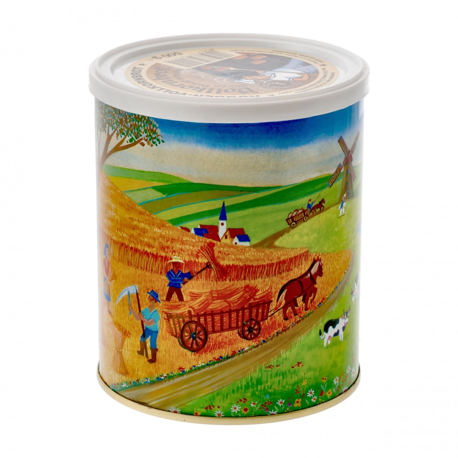 Puszkę wykonano z grubościennej blachy pokrytej powłoką antykorozyjną. Wieko otwierane za pomocą zawleczki bez konieczności używania noża lub otwieracza.
