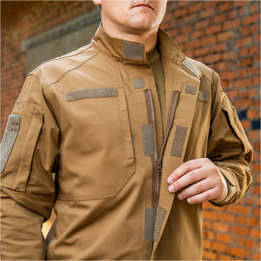 Na klatce piersiowej usytuowane są dwie kieszenie zapinane na rzepy z pionowymi wejściami zapewniającymi swobodny dostęp oraz rzepy Velcro służące do mocowania identyfikatorów osobistych i naszywek. Na każdym z rękawów znajduje się zapinana na suwak kieszeń z pionowym wejściem i rzepem Velcro, z przegrodami serwisowymi służącymi do mocowania uchwytów lub podobnego wyposażenia. W górnej części pleców, pod kołnierzem, umieszczono panel Velcro na znacznik IR.