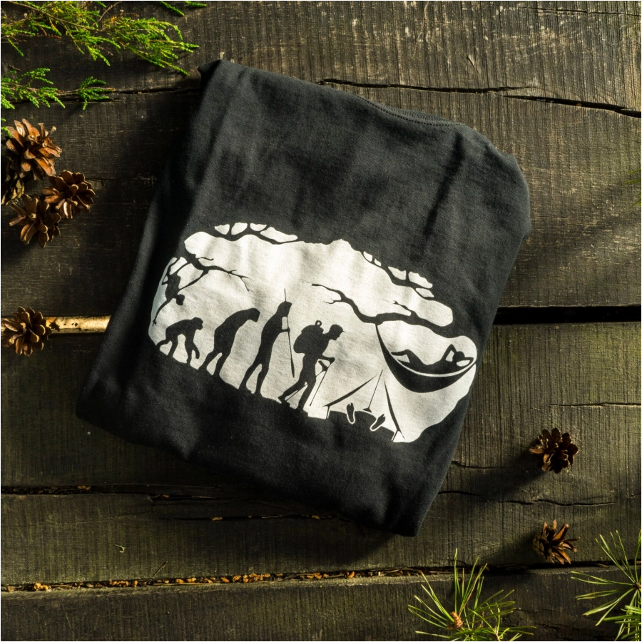 Koszulka Bushcraft Evolution to spojrzenie na ewolucję człowieka w interpretacji marki TigerWood. Na środku klatki piersiowej umiejscowiony jest biały nadruk przedstawiający proces ewolucji w kierunku bushcraftu. Koszulka przypadnie do gustu osobom o niestandardowym sposobie myślenia.