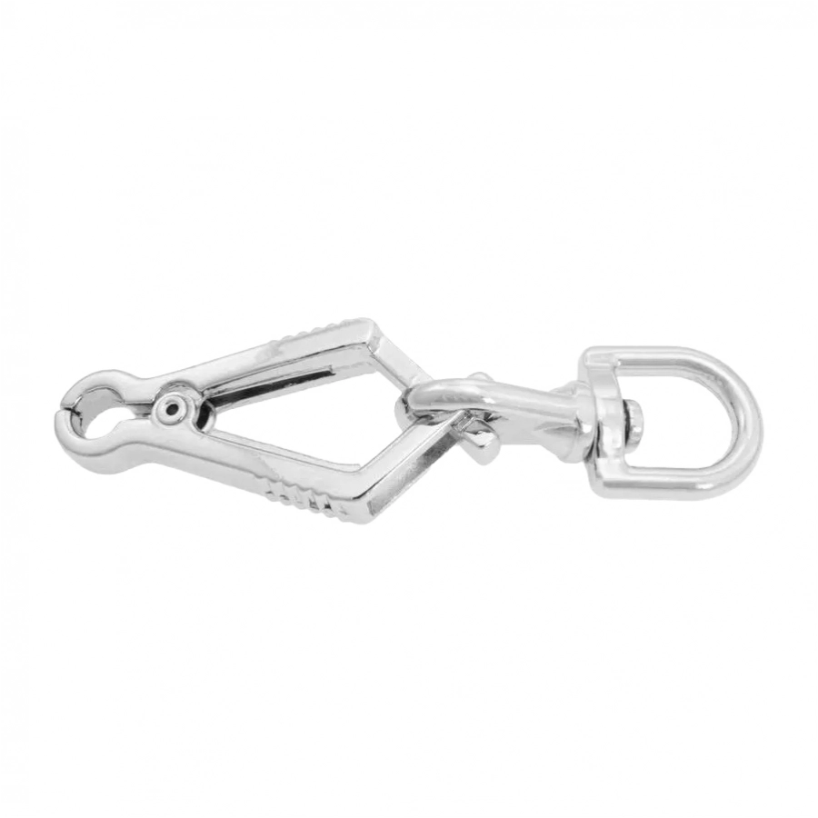 Smycz zakończona jest pokrytym chromową powłoką karabińczykiem tłokowym z krętlikiem. Chrom nie wywołuje reakcji alergicznych u osób uczulonych na nikiel. Istnieje możliwość zastosowania karabińczyka nożycowego z krętlikiem, który umożliwia spuszczenie psa nawet przy pełnym napięciu linki.