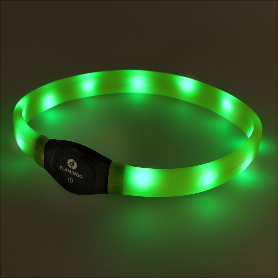 Obroża Flamingo Jumbo posiada 3 tryby świecenia i ładowana jest przy użyciu kabla micro USB, dołączonego do zestawu.