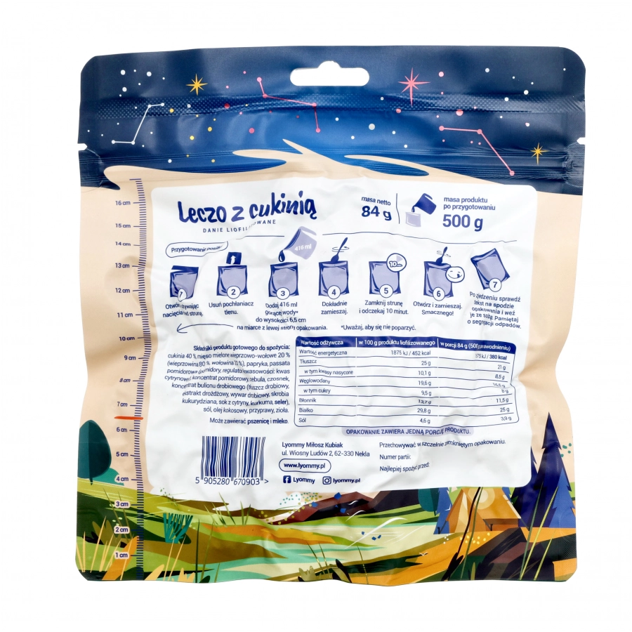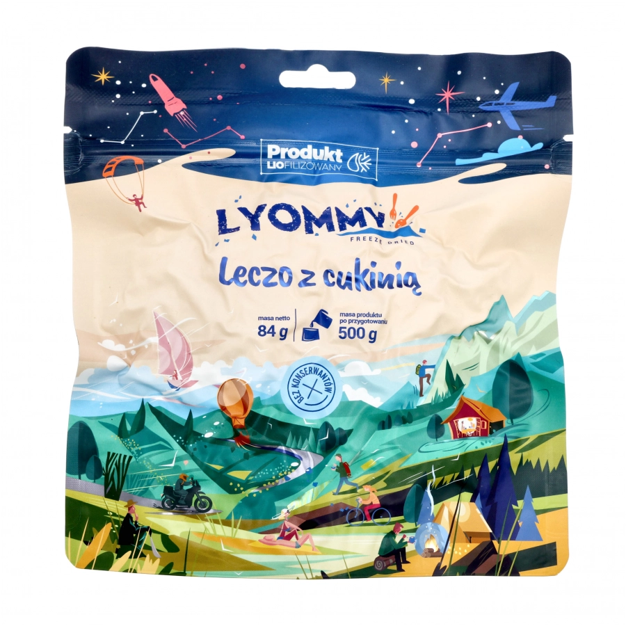Danie liofilizowane Lyommy składa się z mięsa mielonego wieprzowo-wołowego z dodatkiem pysznej cukinii. Kompozycja smakowa oparta jest na tradycyjnej kuchni węgierskiej, w której znajdziemy chrupiącą paprykę oraz pomidory.