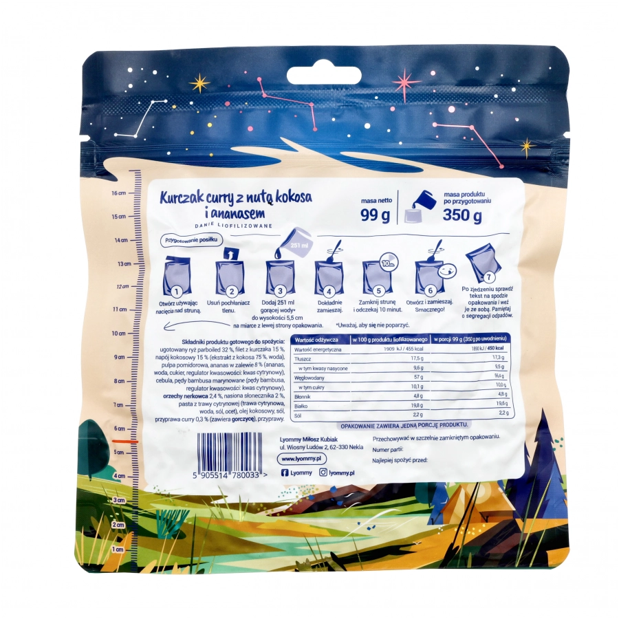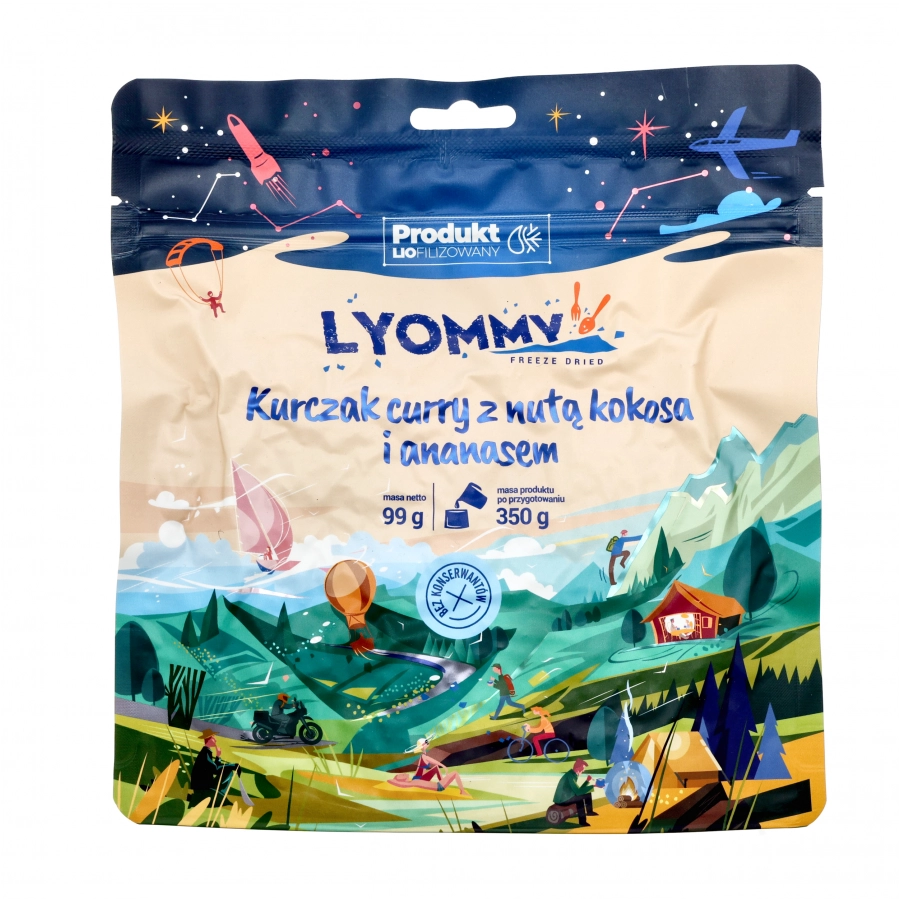 Kurczak curry z nutą kokosa i ananasem to pyszny liofilizowany posiłek od Lyommy. Danie turystyczne inspirowane jest kuchnią indyjską, która charakteryzuje się niesamowitym aromatem i bogactwem przypraw takich jak: imbir, kurkuma i curry nadającym całości niesamowity smak.