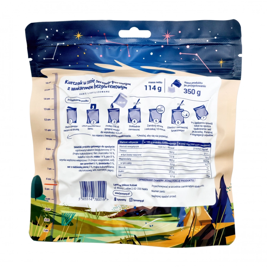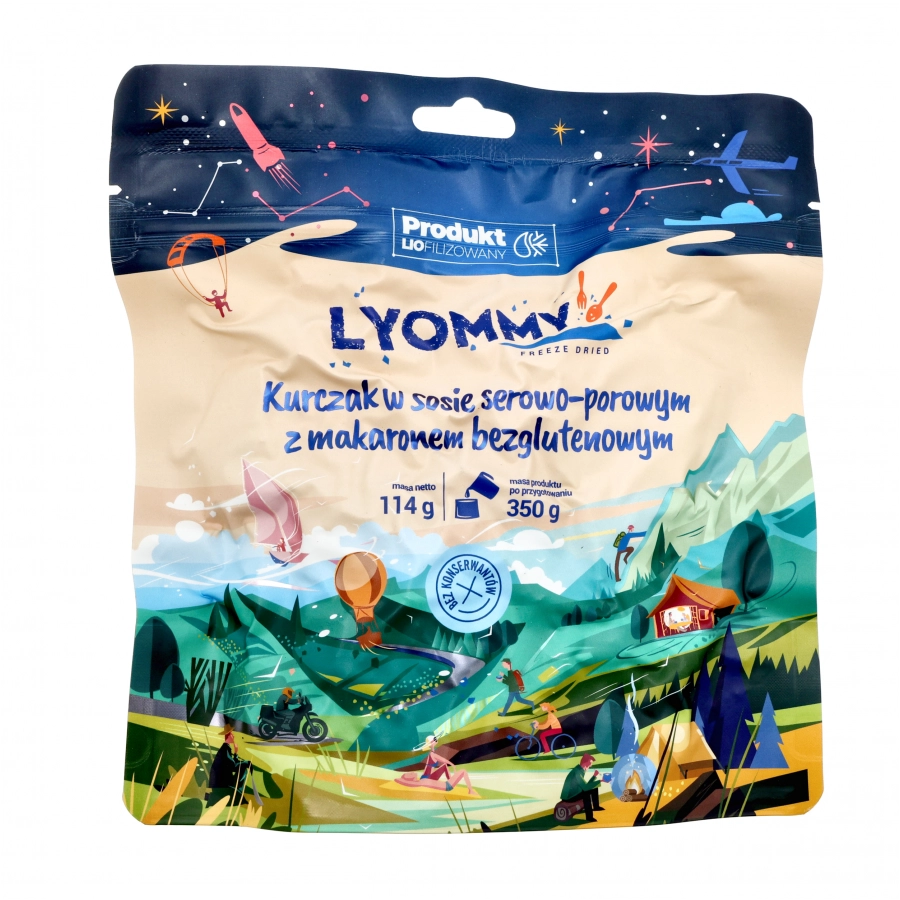Kurczak w sosie serowo-porowym z bezglutenowym makaronem to propozycja wysokoenergetycznego dania liofilizowanego od Lyommy.