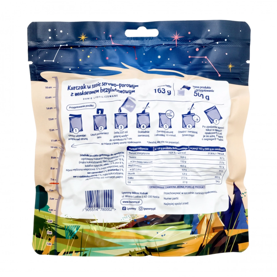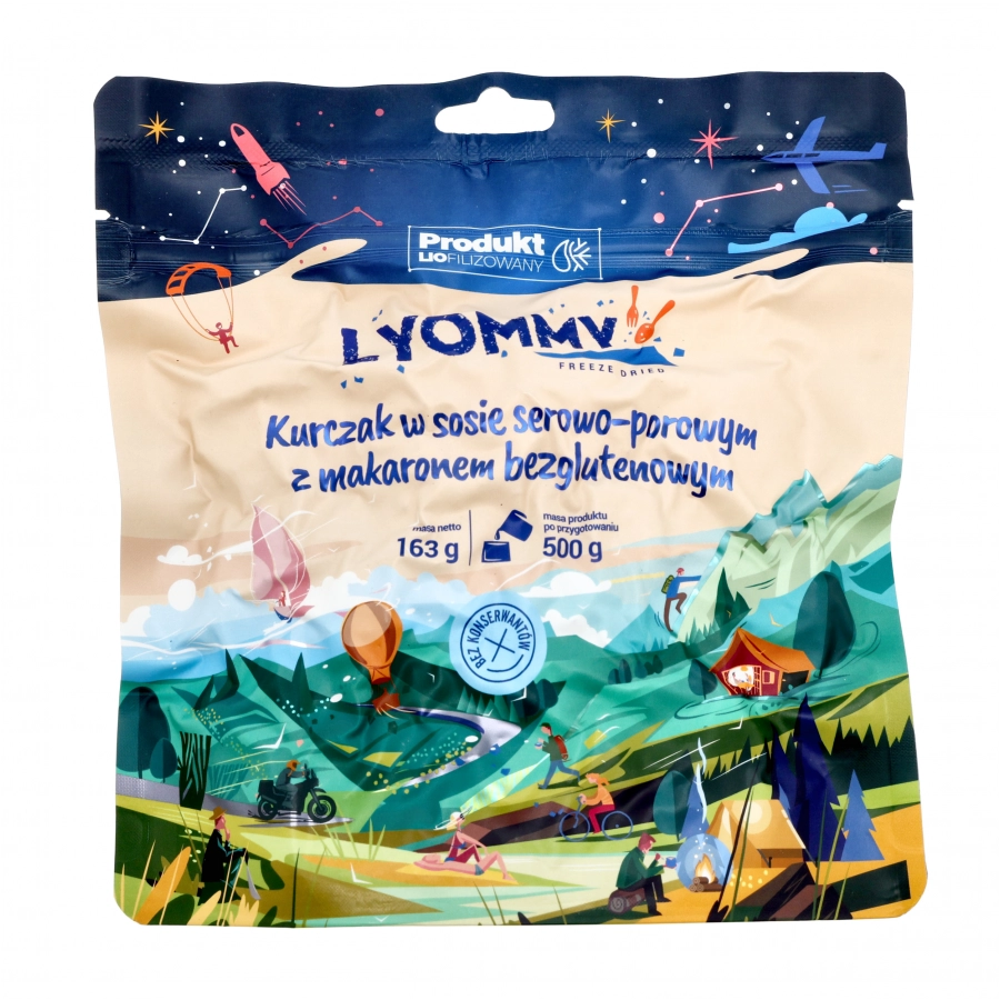 Kurczak w sosie serowo-porowym z bezglutenowym makaronem to propozycja wysokoenergetycznego dania liofilizowanego od Lyommy.