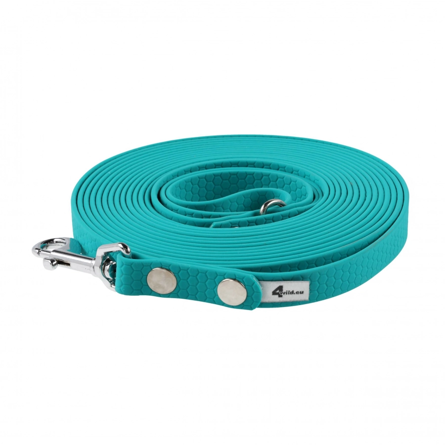 Smycz dla psa BioThane wodoodporna od firmy specjalizującej się w produkcji akcesoriów dla zwierząt 4wild. Smycz została wykonana z taśmy BioThane w kolorze pastelowej zieleni o szerokości 16 mm i długości 5 m.