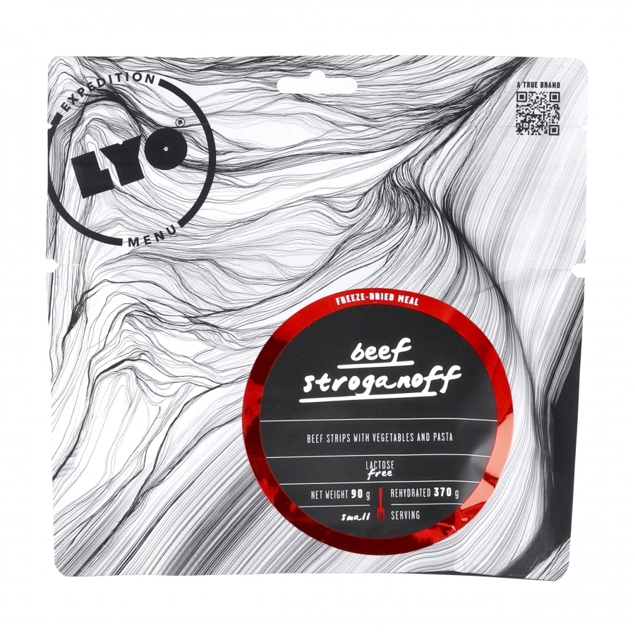 LYOFOOD Strogonow 370 g to pyszne danie liofilizowane, z kawałkami delikatnej wołowiny, makaronem penne, grzybami i cebulą, przyprawione wg oryginalnej receptury producenta. Porcja zawiera duże kawałki mięsa, pokaźną liczbę kalorii, ma niesamowity smak i aromat co z pewności doceni każdy pasjonat tej rosyjskiej potrawy.