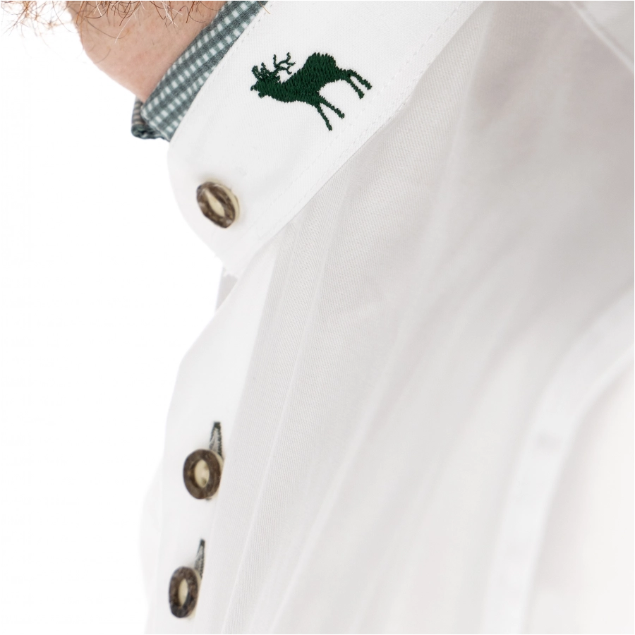 Regularny, wygodny krój nadaje koszuli klasyczny charakter. Hafty w kolorze zielonym, umieszczone na stójce i przedstawiające byka, dodają koszuli indywidualności i wyrafinowanego stylu. Guziki w naturalnym odcieniu doskonale komponują się z resztą projektu, wzmacniając wrażenie harmonii i elegancji.