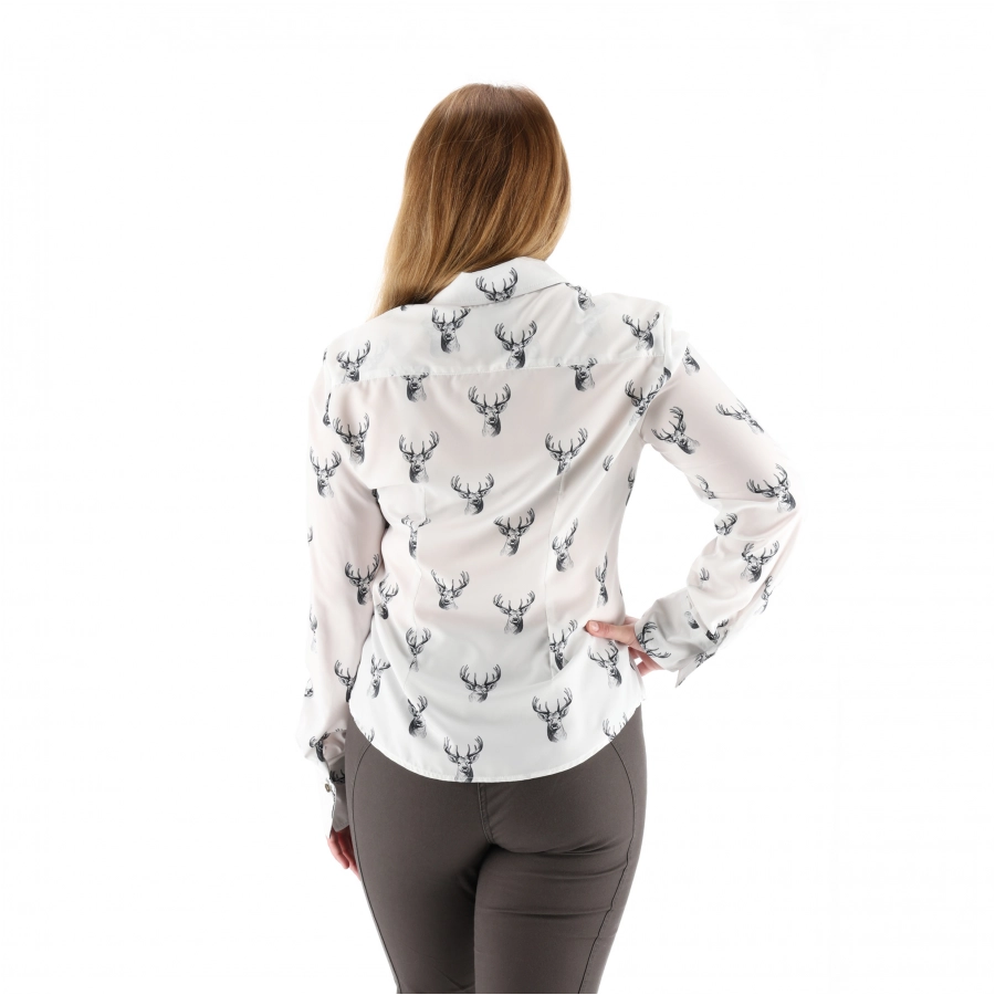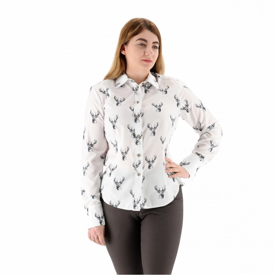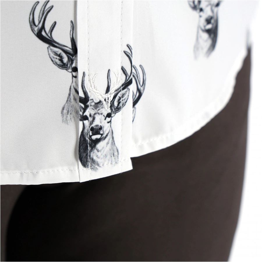 Elegancka koszula Troydeer wyróżnia się wzorem przedstawiającym głowę byka, co z pewnością przypadnie do gustu miłośniczkom natury. Na dolnej części listwy koszuli znajduje się subtelny haft z wizerunkiem byka.